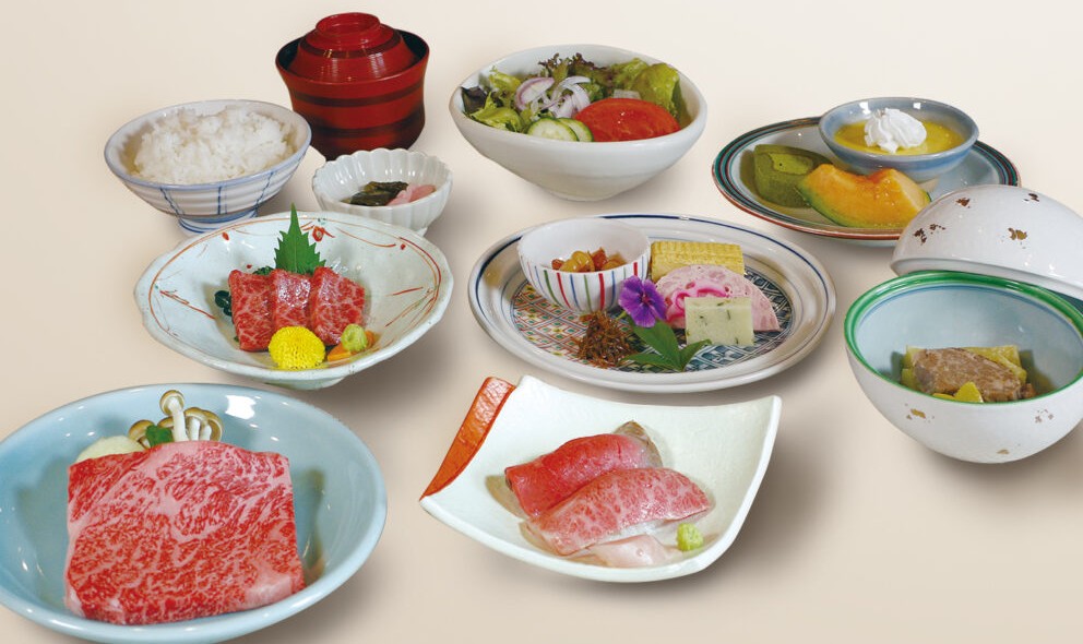 前菜・近江牛刺身・季節の料理・近江牛握り寿司・サラダ・メイン(80g)・御飯・椀物・香の物・デザート